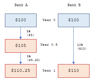 은행A를 선택할 경우, 약정된 10%의 절반인 5%에 상당하는 5불을 6개월 뒤에 ㅂ받게 된다. 은행A의 저축이자가 변경되지 않는다는 가정하에 이 이자는 재투자 될 수 있다. 6개월이 또 지난 후, 약정된 10%의 나머지 절반인 5%(5불)을 받게되고, 재투자했던 원금 5불에 대한 약정이자 10%의 절반인 5%에 해당하는 0.25불 또한 지급받는다. 은행A에 저축하여 수령하게 되는 이자액의 총합은 10.25불으로, 은행B의 이자수익인 10불 보다 0.25불 높은 수익을 얻게 된다.