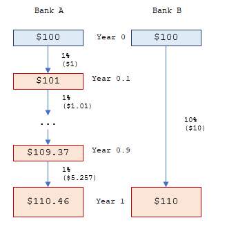 이번에는 두 은행이 같은 기간 내에 10%에 해당하는 현금을 지급한다고 가정하자. 위 예제와 다르게 같은 기간, 같은 이자다. 하지만 은행A는 원금의 5%에 해당하는 이자를 6개월 마다 두번에 걸쳐 지급하고, 은행B는 원금의 10%에 해당하는 이자를 1년 뒤에 한번 지급한다.