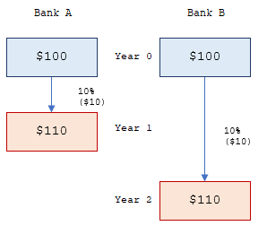 Now, imagine Bank A pays 10% in 1 year while Bank B pays 10% in 2 years. What would you prefer?