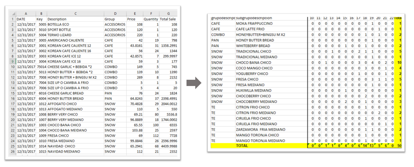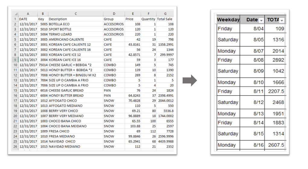 On the left is the transaction-level data provided by the POS system. On the right is how my friend aggregated the daily sales. This table did not contain sufficient information.