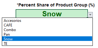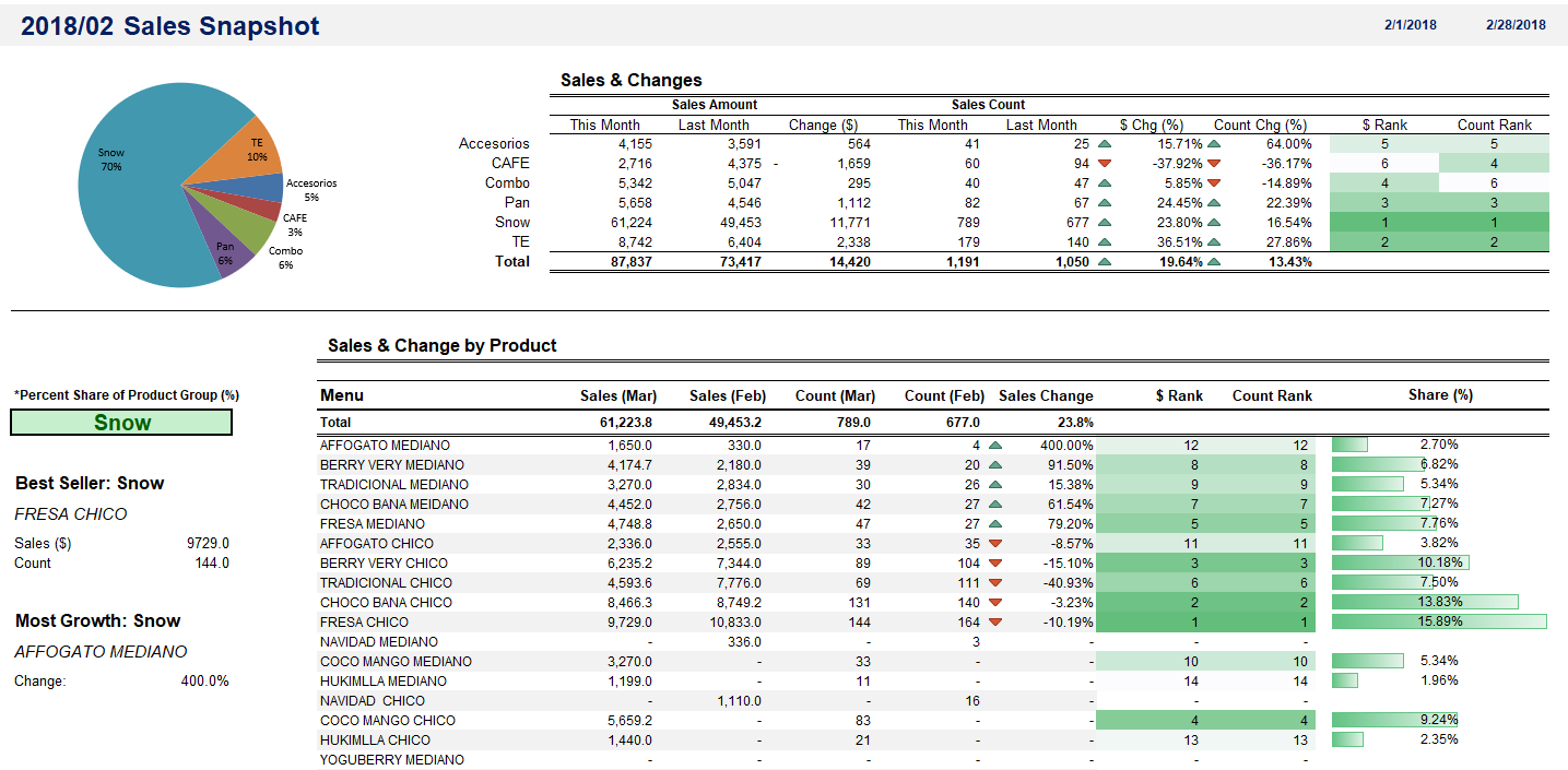 To the left of the Sales & Change by Product table is a dropdown cell that contains the list of product groups.