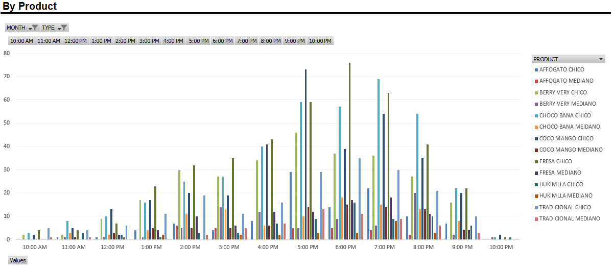 The next analysis is sales breakdown by more granular periods: weekday and hour. Based on the transaction-level data, pivot table was created. This pivot table was then used to create pivot charts with multiple filters.