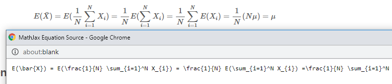 1. 우선, html환경 내에 사용된 Mathjax 수식이 궁금하다면, 수식 위에 커서를 두고 > 오른쪽 클릭 > Show Math As > Show TeX hints in MathML 을 클릭하면 된다.